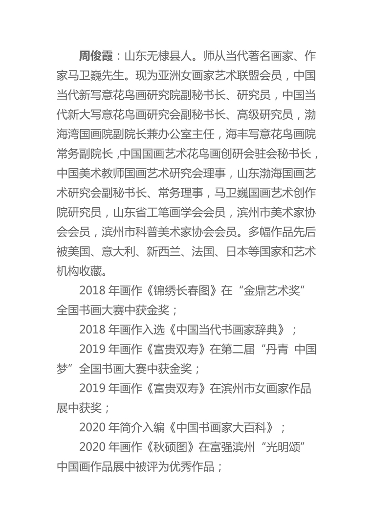 周俊霞:山东无棣县人。师从当代著名画家、作家马卫巍先生。现为亚洲女画家艺术联盟会员,中国当代新写意花鸟画研究院副秘书长、研究员,中国当代新大写意花鸟画研究会副秘书长、高级研究员,渤海湾国画院副院长兼办公室主任,海丰写意花鸟画院常务副院长,中国国画艺术花鸟画创研会驻会秘书长,中国美术教师国画艺术研究会理事,山东渤海国画艺术研究会副秘书长、常务理事,马卫巍国画艺术创作院研究员,山东省工笔画学会会员,滨州市美术家协会会员,滨州市科普美术家协会会员。多幅作品先后被美国、意大利、新西兰、法国、日本等国家和艺术机构收