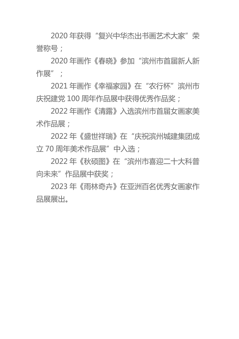 2019年画作《富贵双寿》在滨州市女画家作品展中获奖;